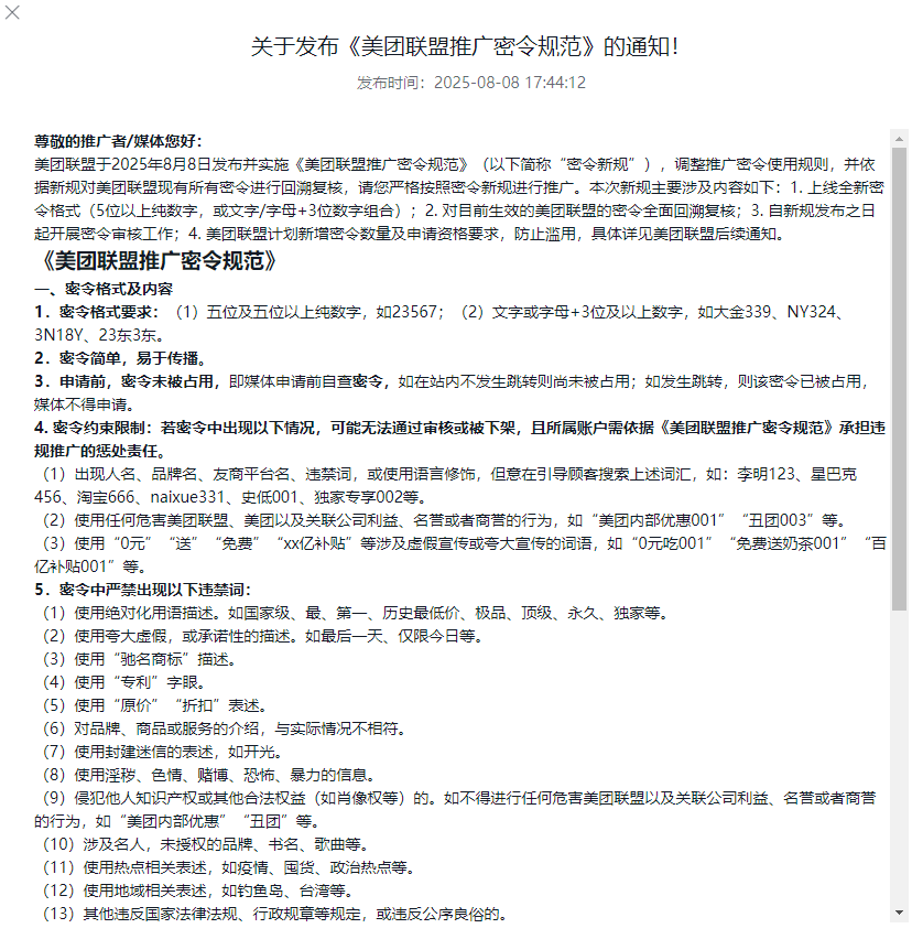 1370 浏览 接官方通知,申请美团密令词格式要求: