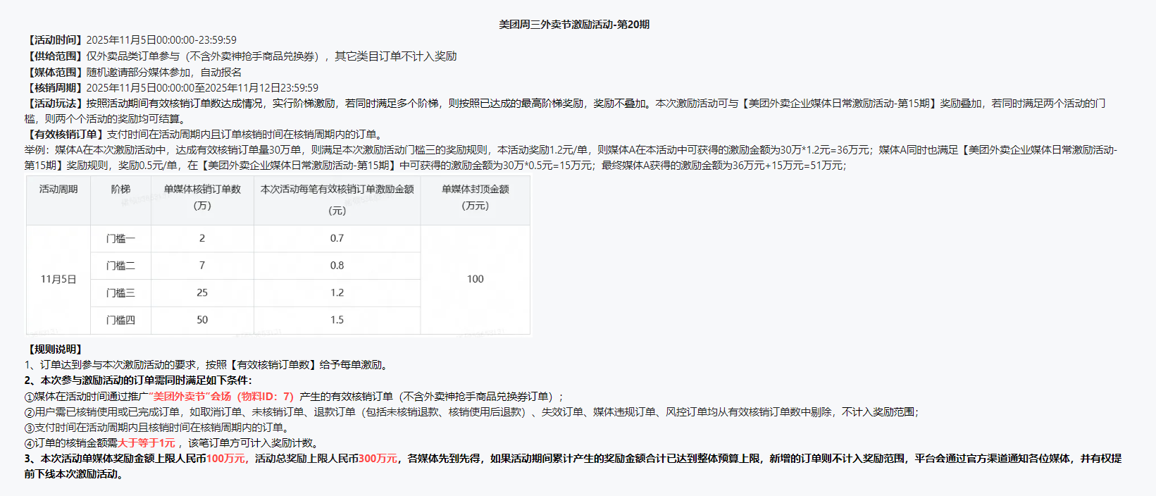1.美团外卖节会场有效核销订单金额≥1元计入激励;