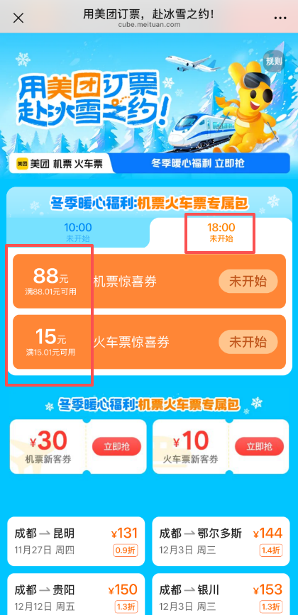 58 浏览 🔔接官方通知,即日起至12月31日,【美团-百元特价票】每日投放88元大额机票立减券,及15元大额火车票立减券,新老用户均可领取,每日限量2张,先到先得,领完即止