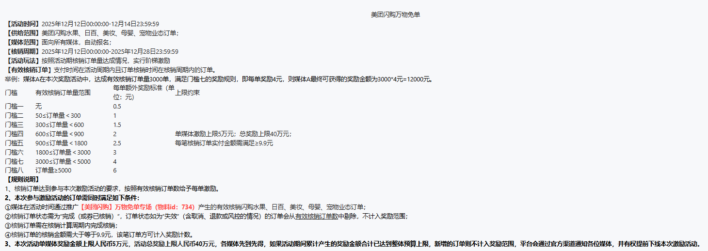 1.【美团闪购】万物免单”会场内的水果、日用百货、美妆、母婴、宠物类目订单参与,会场外部订单,其它类目订单不计入奖励;