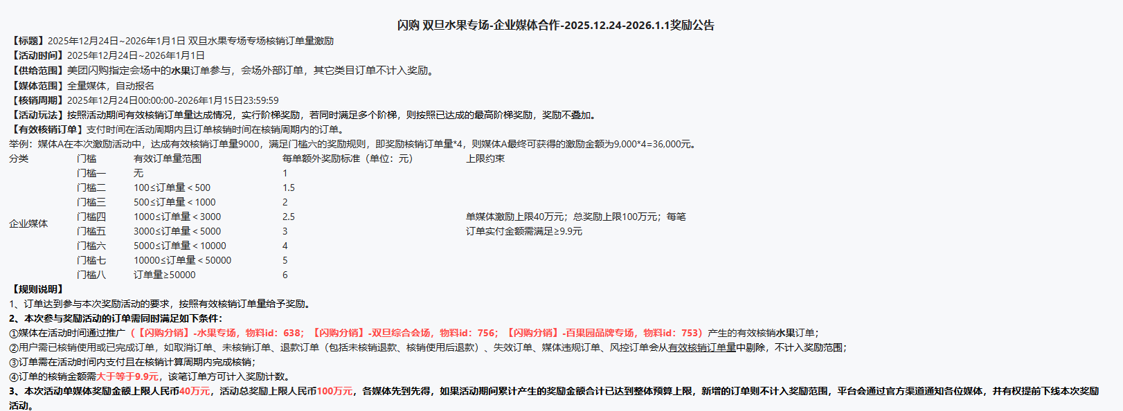 1.【美团闪购】双旦水果专场、参与活动:【美团闪购-水果专场】、【美团闪购-百果园免单抽专场】;