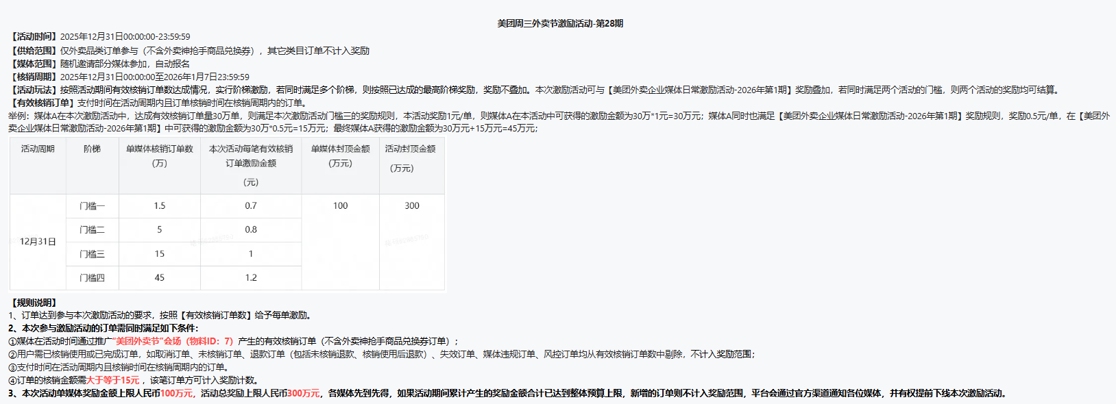 1.美团外卖节会场有效核销订单金额≥15元计入激励;