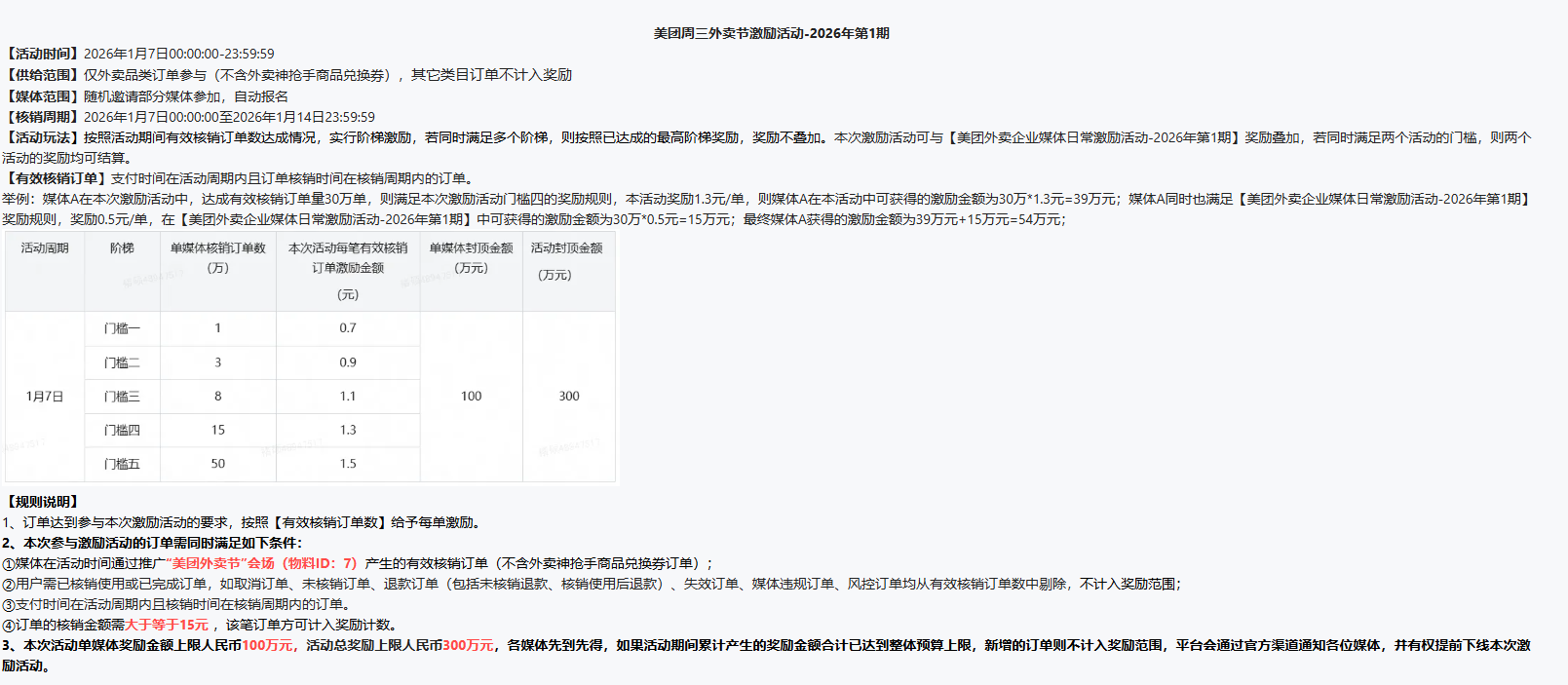 1.美团外卖节会场有效核销订单金额≥15元计入激励;