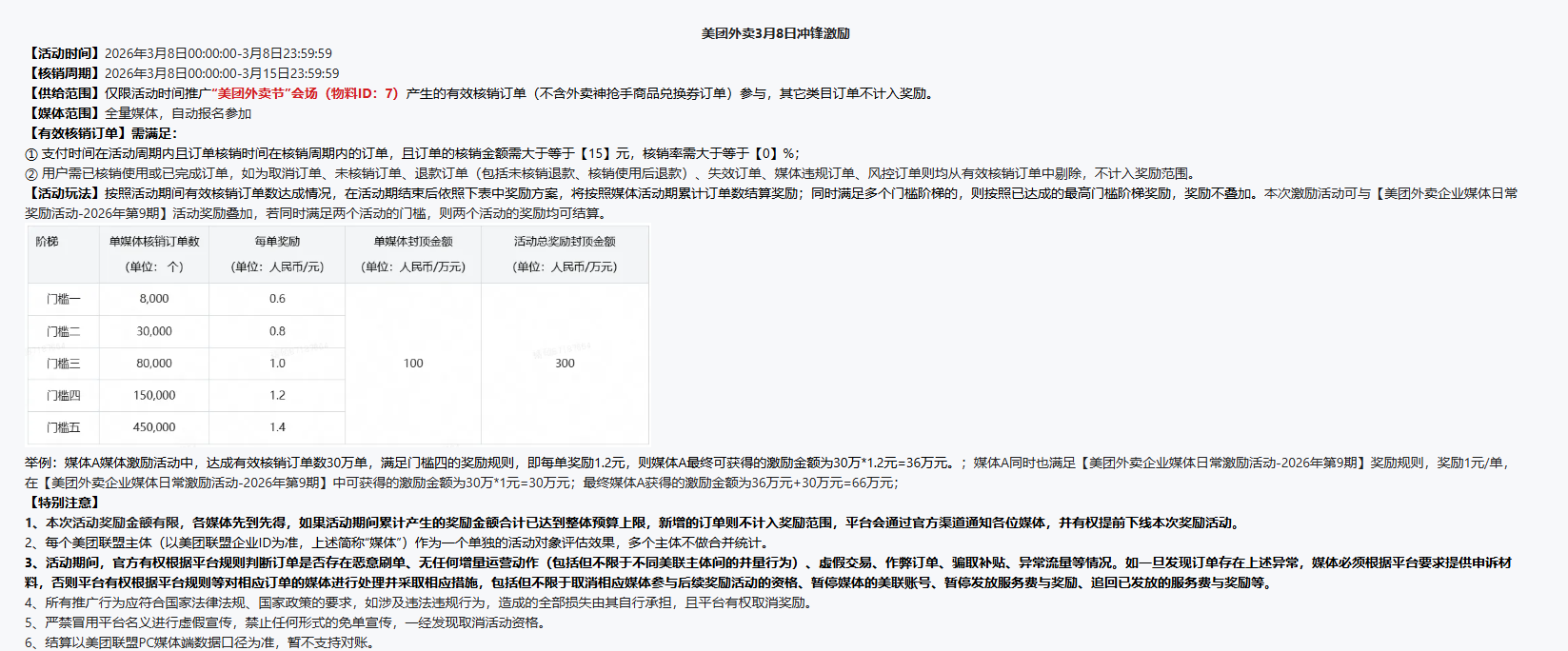 1.美团外卖节会场有效核销订单金额≥15元计入激励;