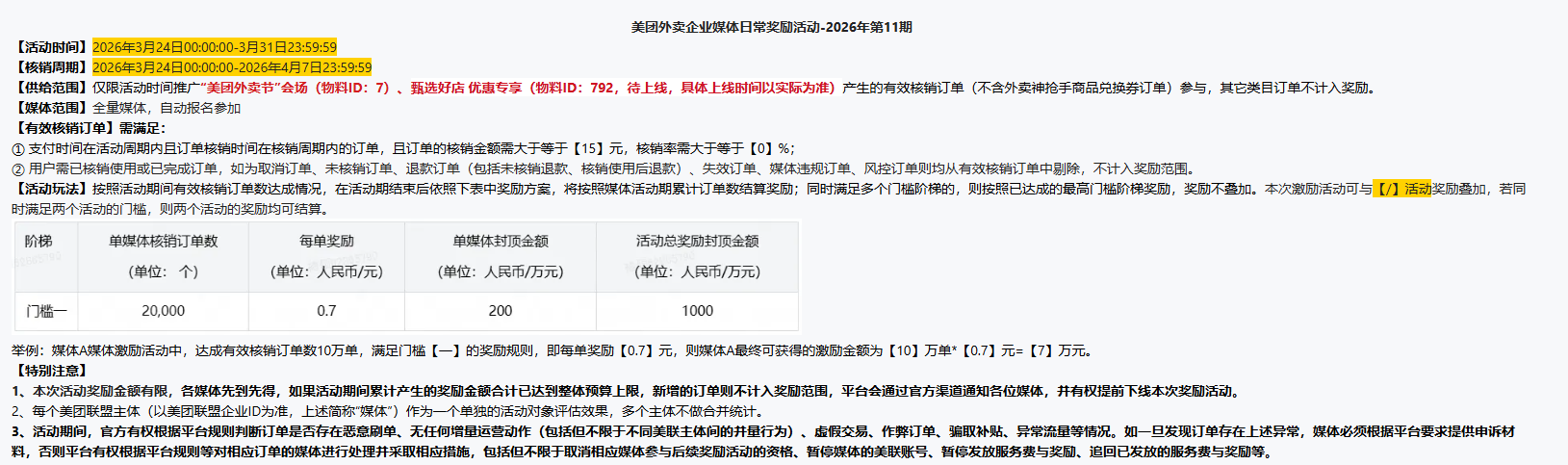 1.美团外卖节会场有效核销订单金额≥15元计入激励;