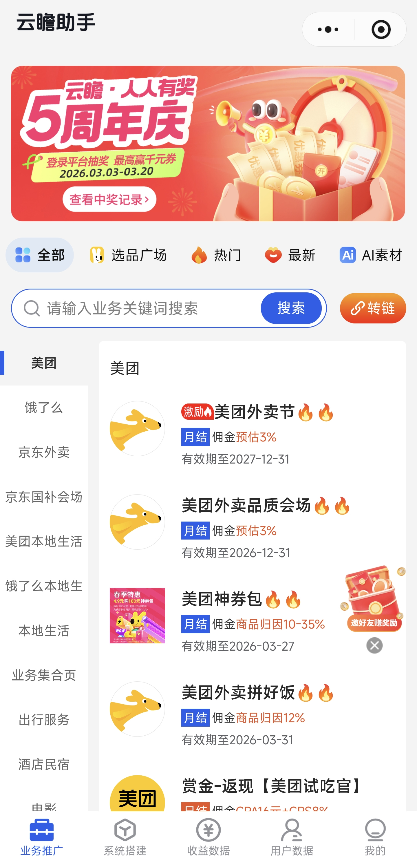 云瞻助手。从定位上来说,云瞻助手是一个覆盖吃喝玩乐购五大消费场景资源的创业平台,它并不是单纯给你一个推广入口,而是帮助你去搭建一个真正能承接流量的聚合 CPS 系统。