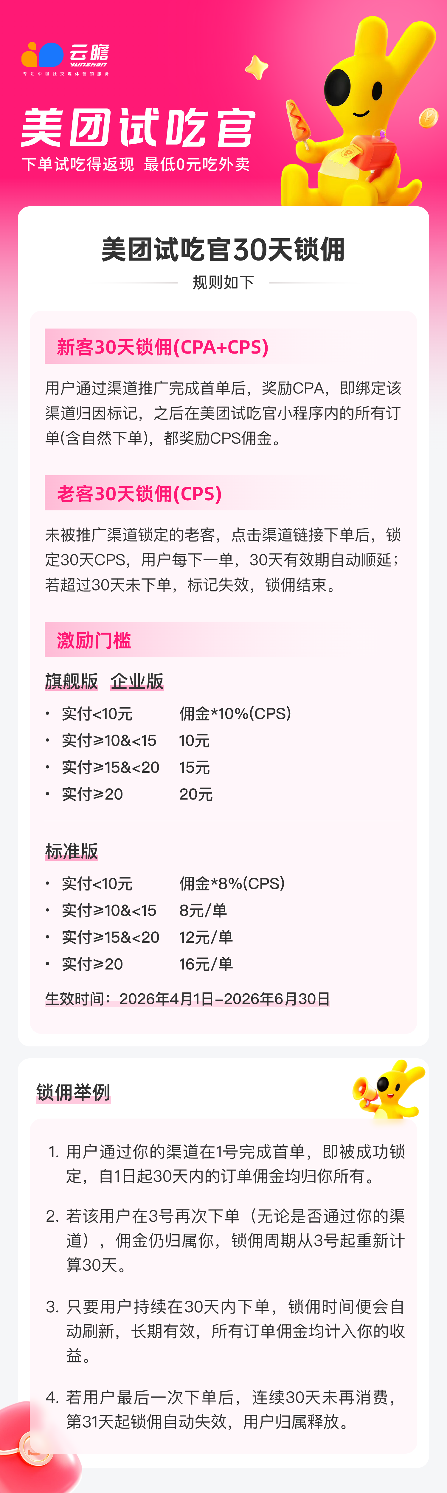 ✅美团试吃官含30天锁拥政策,绑定渠道归因标记,之后在美团试吃官小程序内的所有订单(含自然下单),都奖励CPS佣金。