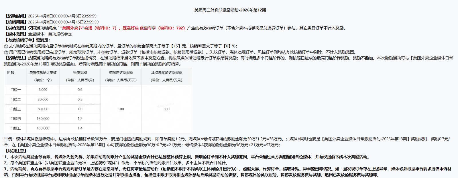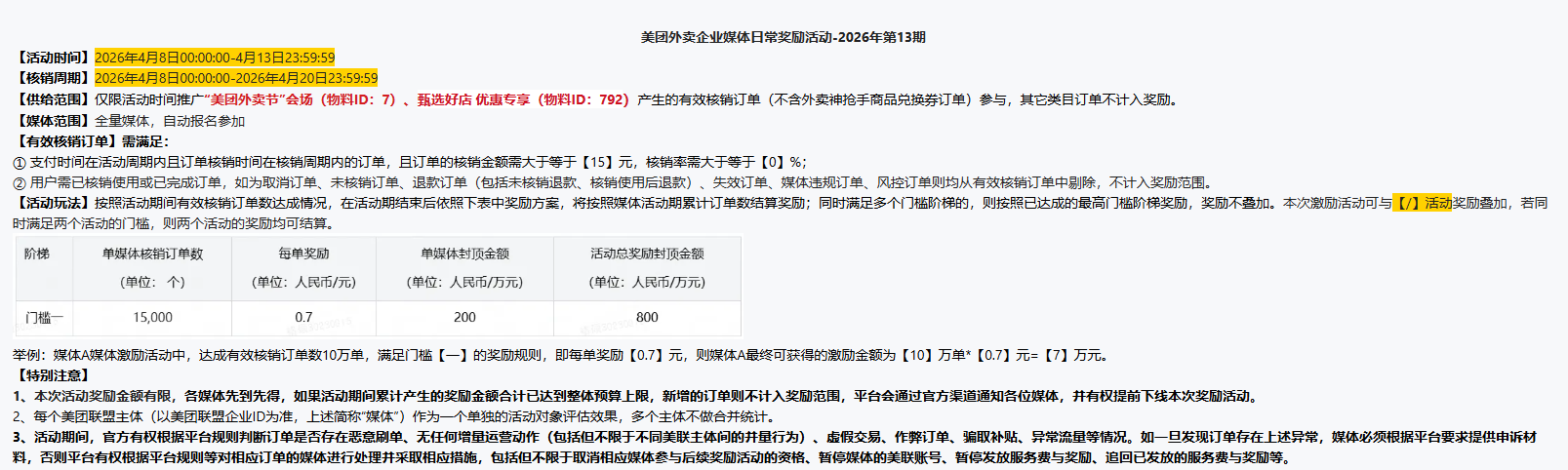 1.美团外卖节会场有效核销订单金额≥15元计入激励;