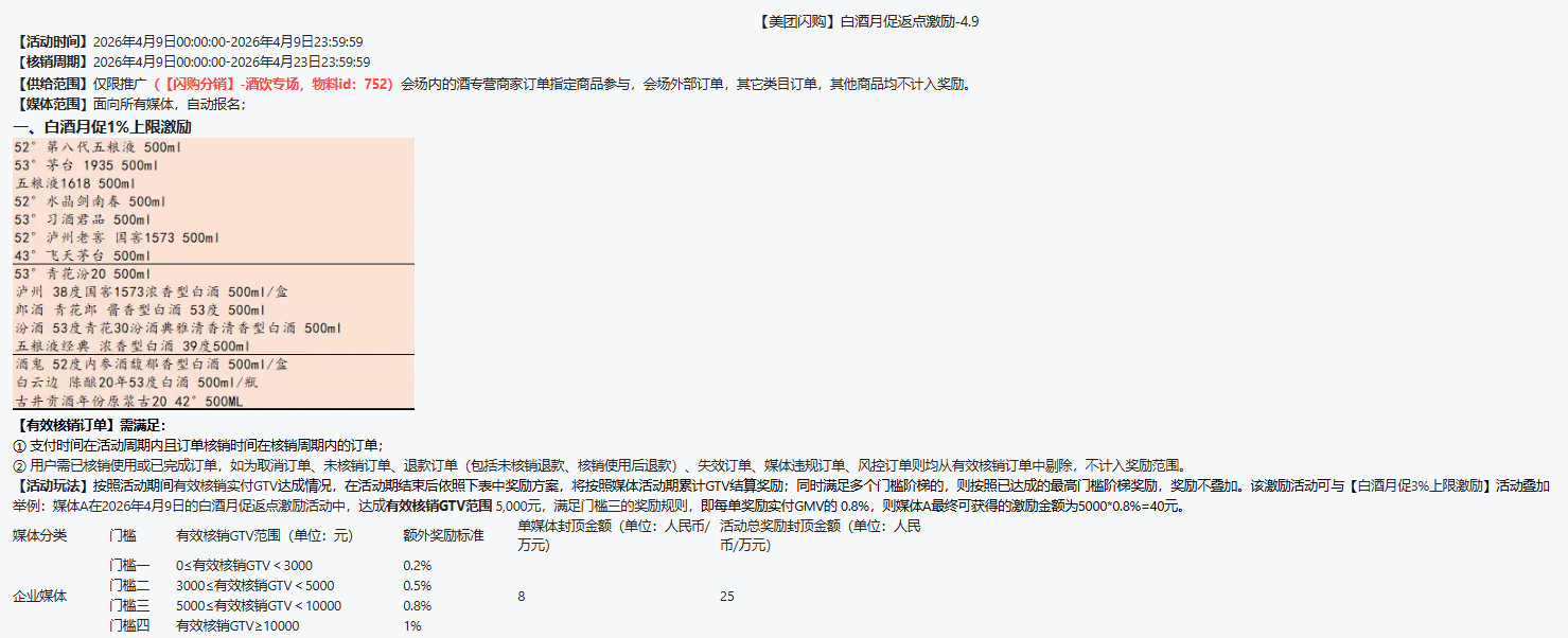 34 浏览 一、🔥【美团闪购】白酒月促1%上限激励🔥