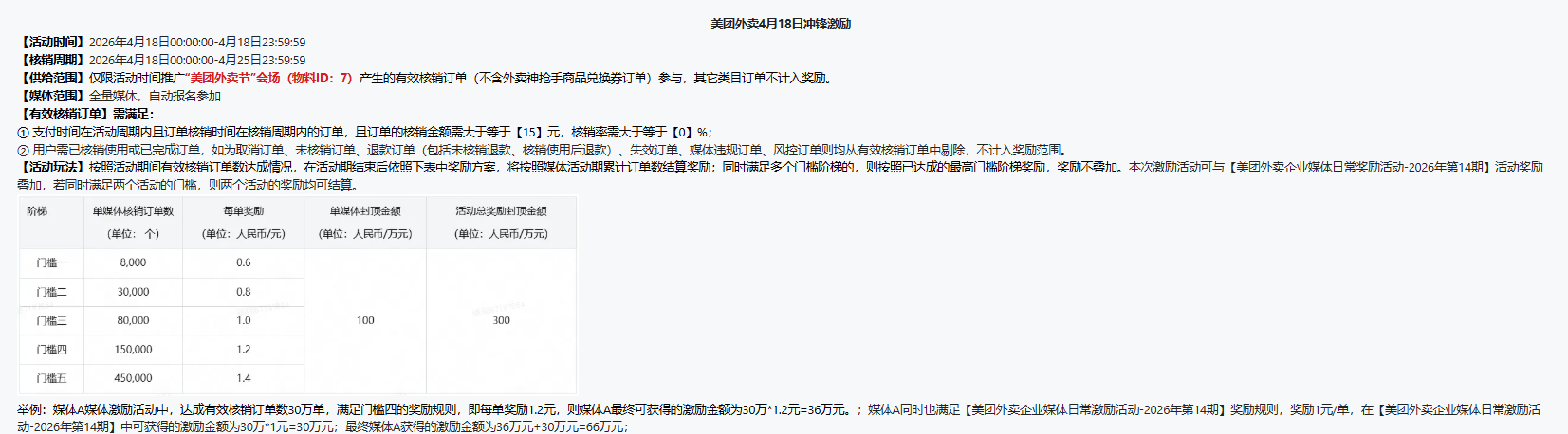1.美团外卖节会场有效核销订单金额≥15元计入激励,核销率需大于等于【0】%;