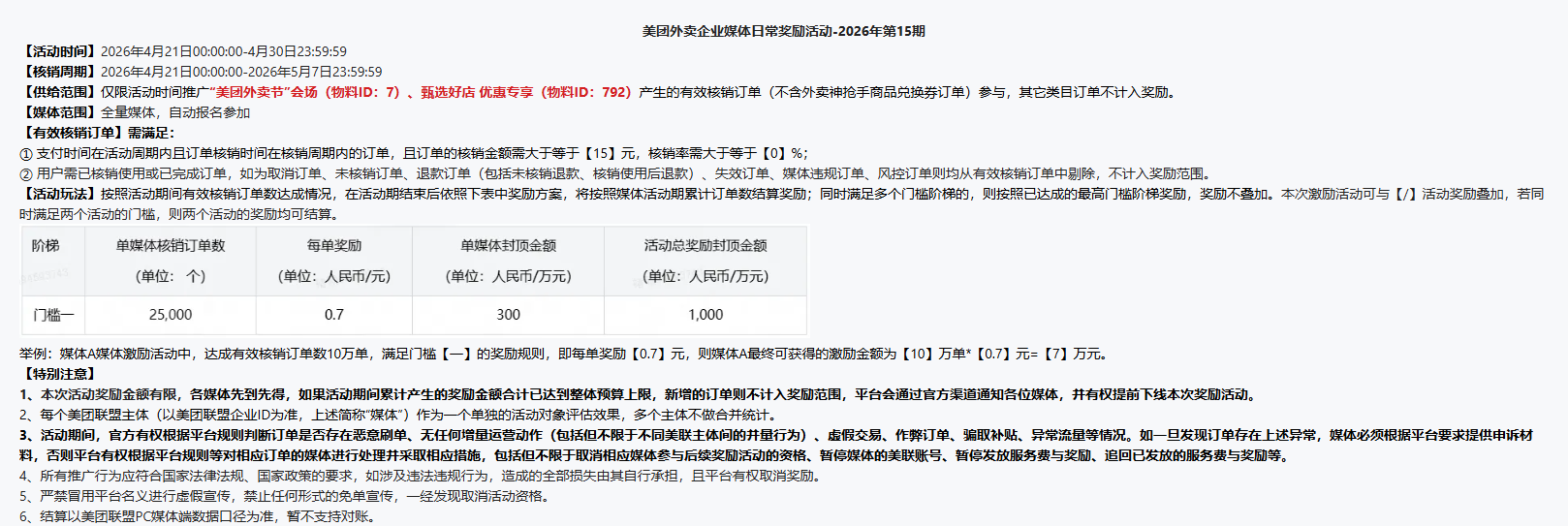 门槛1:25000单,每单0.7元;